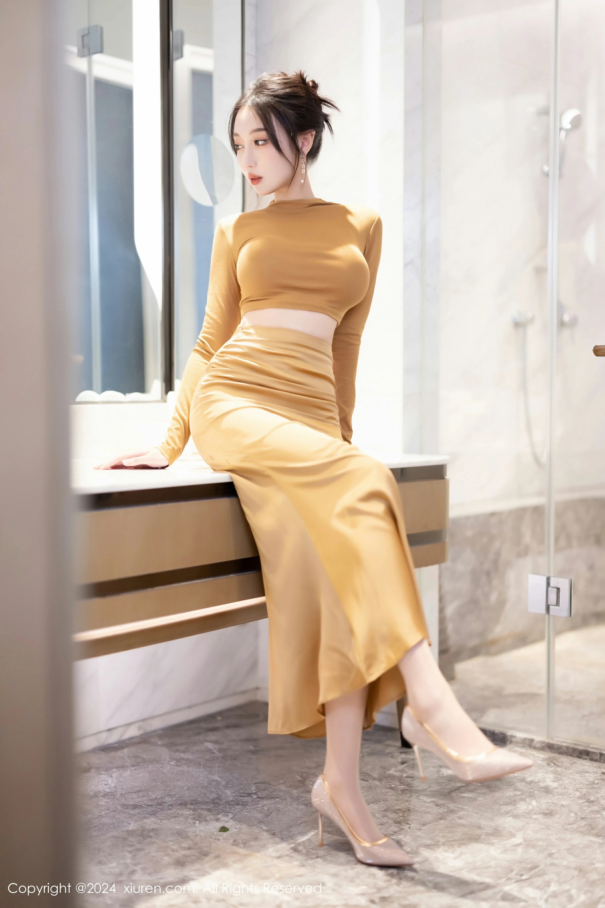 一进入照片的世界,你会被模特@玥儿玥所展现的优雅魅力深深吸引。她身穿一袭黄色长裙,细腰线勾勒出她婀娜多姿的身姿。这条长裙与她的肤色相得益彰,散发出一种温柔的光芒。而她搭配的原色丝袜更是增添了一丝神秘感,使整个形象更加完美。