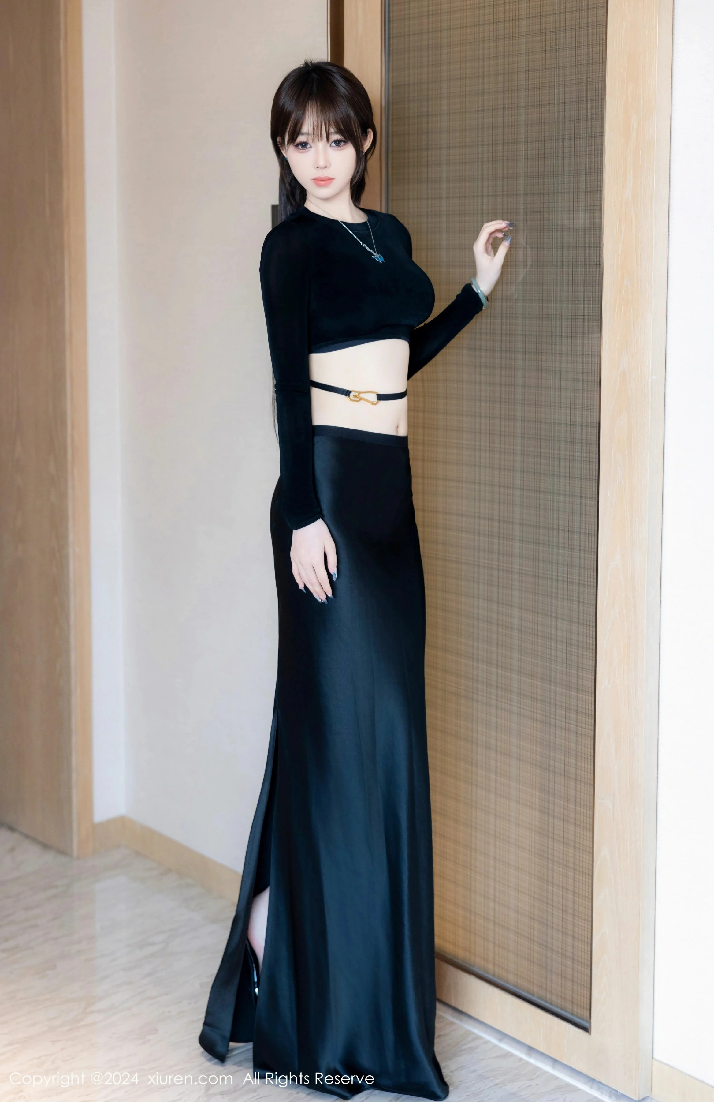 黑色上衣搭配黑色长裙是一种经典的时尚搭配,能够展现女性的优雅和性感。@奶瓶.作为模特,展示了她纤细修长的双腿,散发出迷人的气息。这样的搭配不仅适合各种场合,还能给人一种神秘感和内敛的性感。这样的衣服能够凸显女性的身材优势,同时又不会显得过于暴露,给人一种高贵和艺术的感觉。